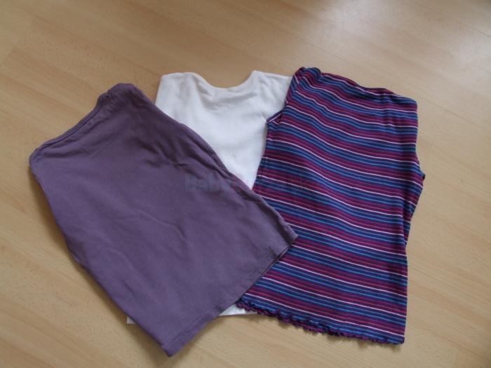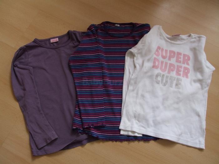 Predám dievčenské tričká s dlhým rukávom. Fialové tričko je takmer nepoužívané. Fialové prúžkované je s jemným nariasením na rukávoch a v spodnej časti. Biele tričko má vzadu malý fliačik, inak bez poškodenia.Cena za všetky spolu, ale predám aj jednotlivo.